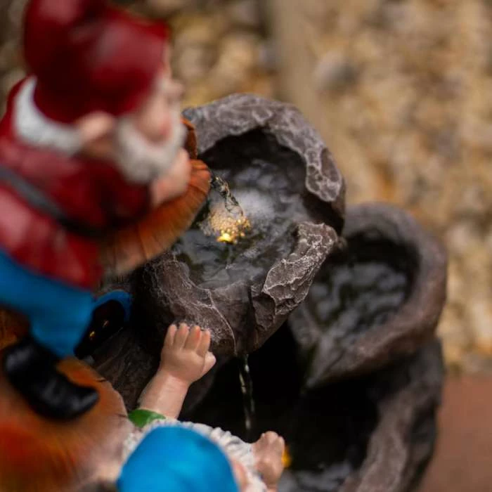 It’s a good thing these gnomes haven’t heard of guttering, otherwise this cascade wouldn’t go much further than the roof! As it is, the water keeps pouring with this cascade water feature made from UV- and frost-resistant polyresin (to resist life’s wears and tears) cast in the shape of gnomes, toadstool homes and stone-effect pools. Featuring a four-level cascade and water-filled reservoir, this water feature will be a great talking point for any garden, and all it needs is a sunny spot to get the water flowing. And, with LED lights to illuminate the water flow and feature, you can enjoy every part of this fountain come day or night (with battery backup!).