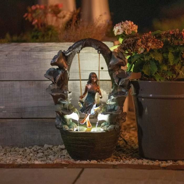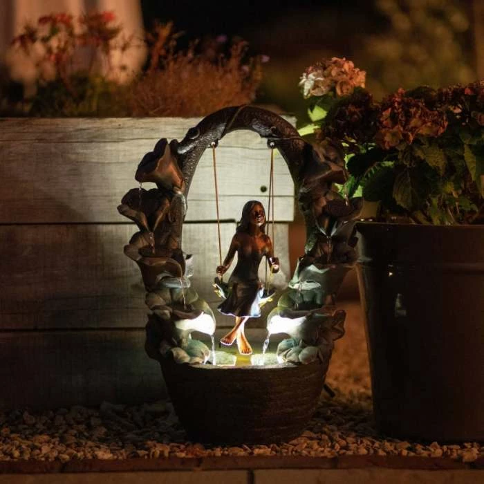 This tiered cascade water feature, made of UV- and frost-resistant polyresin (to resist life’s wears and tears), is cast in the shape of a garden nymph swinging under bell-shaped flowers. Featuring a five-level cascade and water-filled reservoir, this water feature will be a great talking point for any garden or table. And, with LED lights to illuminate the water flow and feature, you can enjoy every part of this fountain come day or night.