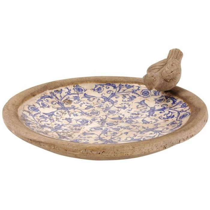 Ceramic bird bath with Aged Ceramic print and bird detail.