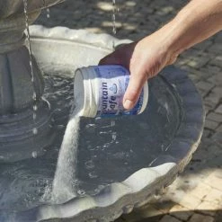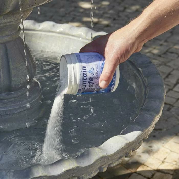 Simply add two capfuls (depending on the size of the feature) to the reservoir or pebble pool and the active formula will prevent all common forms of algae growth and slime. Two teaspoons treats up to 25 Litres of water for one month. The bulk size Fountain Safe contains over 200% more treatment than the standard size.