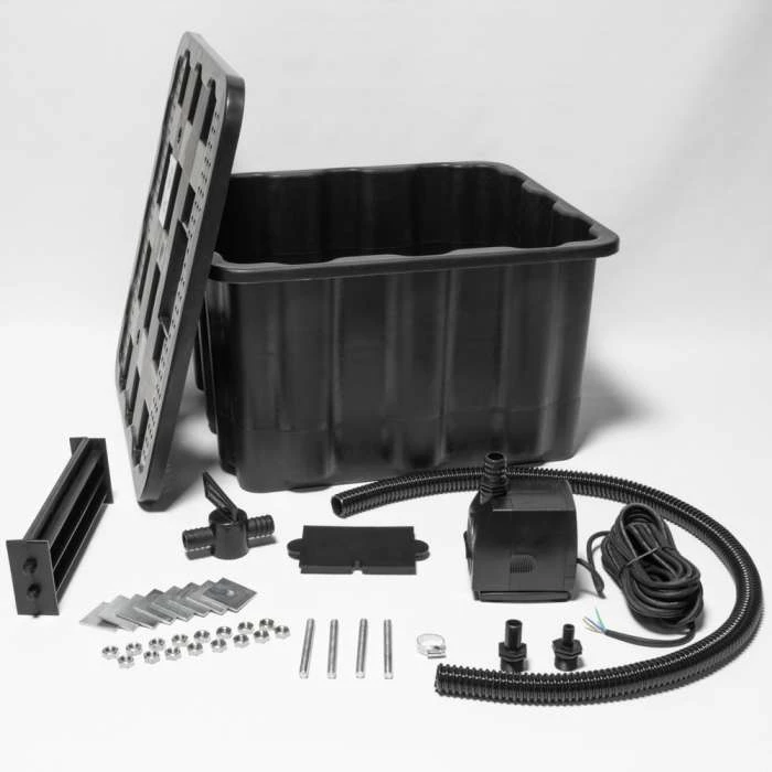Pebbles or slate can be placed on the lid when everything has been fixed into place, offering an attractive contrast between the sleek modern features of the wall and the natural world. It also serves the dual purpose of concealing the feet and the pump. Please see the link at the bottom of the page.