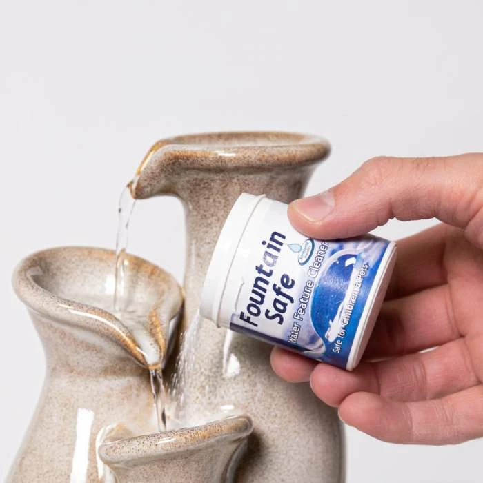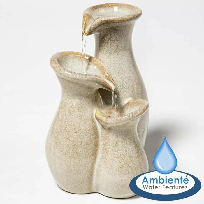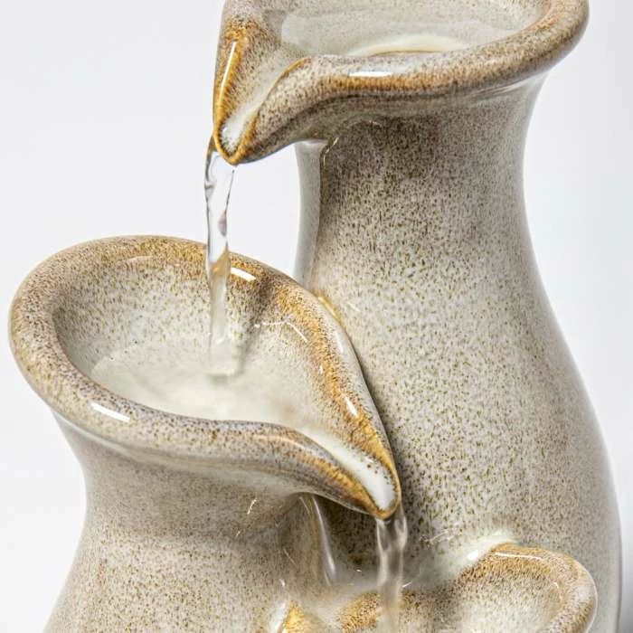 This compact and uncomplicated water feature is perfect for an elevated surface, where it can be enjoyed by all. Although small, the cascading design is full of character and will bring delight to your eyes and ears. It’s a fantastic piece of table dressing, and your guests are bound to find their eye drawn back to it time and time again. This water feature is mains operated, meaning it can be turned on at any time of day or night. The jars are coated in an ivory ceramic glaze with sandy flecks, which gives the jars a shiny finish and keeps it water tight.