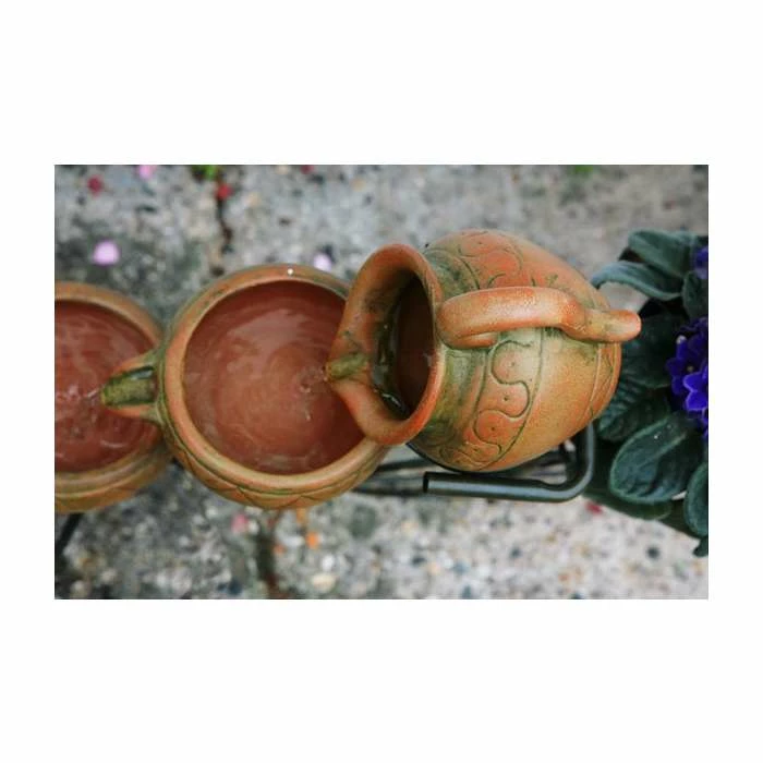 This decorative water feature is bound to attract the attention of neighbours and friends alike. Climbing plants, such as clematis or honeysuckles, will thrive if grown over and around the frame. Water flows freely from the four pots, running down in a gentle cascade to the larger bowl at the bottom.