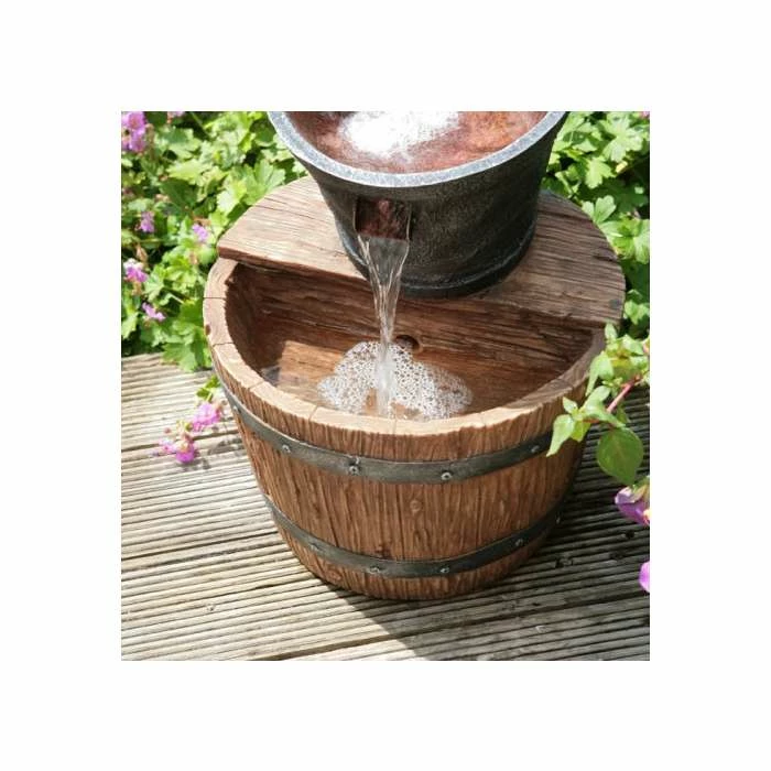 This self-contained Iron Tap Bucket and Barrel Cascade Water Feature features a natural oak effect barrel and watering post with a classic iron tap and bucket. It has been manufactured from high quality polyresin material, which is practical, durable, and lightweight. Its lightweight construction allows for easy portability and manoeuvring and will look great wherever you decide to place it: in a flower bed, glass house, a conservatory, patio decking or even on your driveway. Combining classic looks and modern manufacturing techniques, polyresin is both frost and UV resistant helping this water feature to withstand the elements. Watch the water as it pours out of the tap into the pail before gently cascading into the wood-like barrel below, creating a wonderful display, very soothing to sit by.