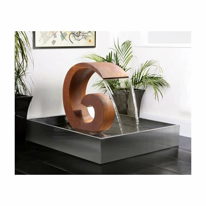 This magnificent water feature is manufactured from Corten steel, which provides it with its spectacular unique appearance. As water flows from the spout of the feature, the Corten steel reacts to create a layer of rust, thereby oxidising the surface to provide weatherproof and corrosion-resistant qualities as well as a striking rustic aesthetic. Weathered steel is quickly becoming a staple of modern architecture, praised for its unique contemporary style. Contrast the fountainâs corten steel with the included stainless steel reservoir, which makes this feature suitable for indoor use.