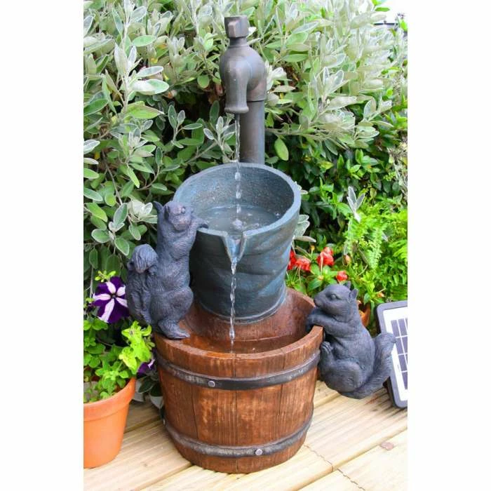 This adorable water feature, complete with two playful squirrels, is sure to become the main focal point of your garden. Water gently runs from the tap and pours down in to the stacked bucket and barrel below. This water feature is crafted from polyresin and is UV and frost resistant.