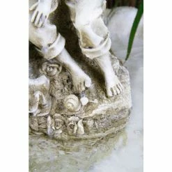 The meticulous attention to detail on the children’s clothes adds to the graceful aesthetic of the piece, and the ornate scalloped basin adds an antique charm to its surroundings.