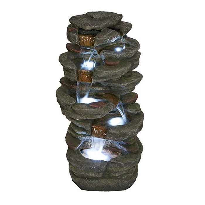 Kettering Rock Falls By Aqua Creations is a self-contained natural look design poly-resin water fountain. The cascading water is lit by striking LED lights in each of the pools, which allows your fountain to be enjoyed both day and night. With its intricate design it will capture the attention of all family and friends.